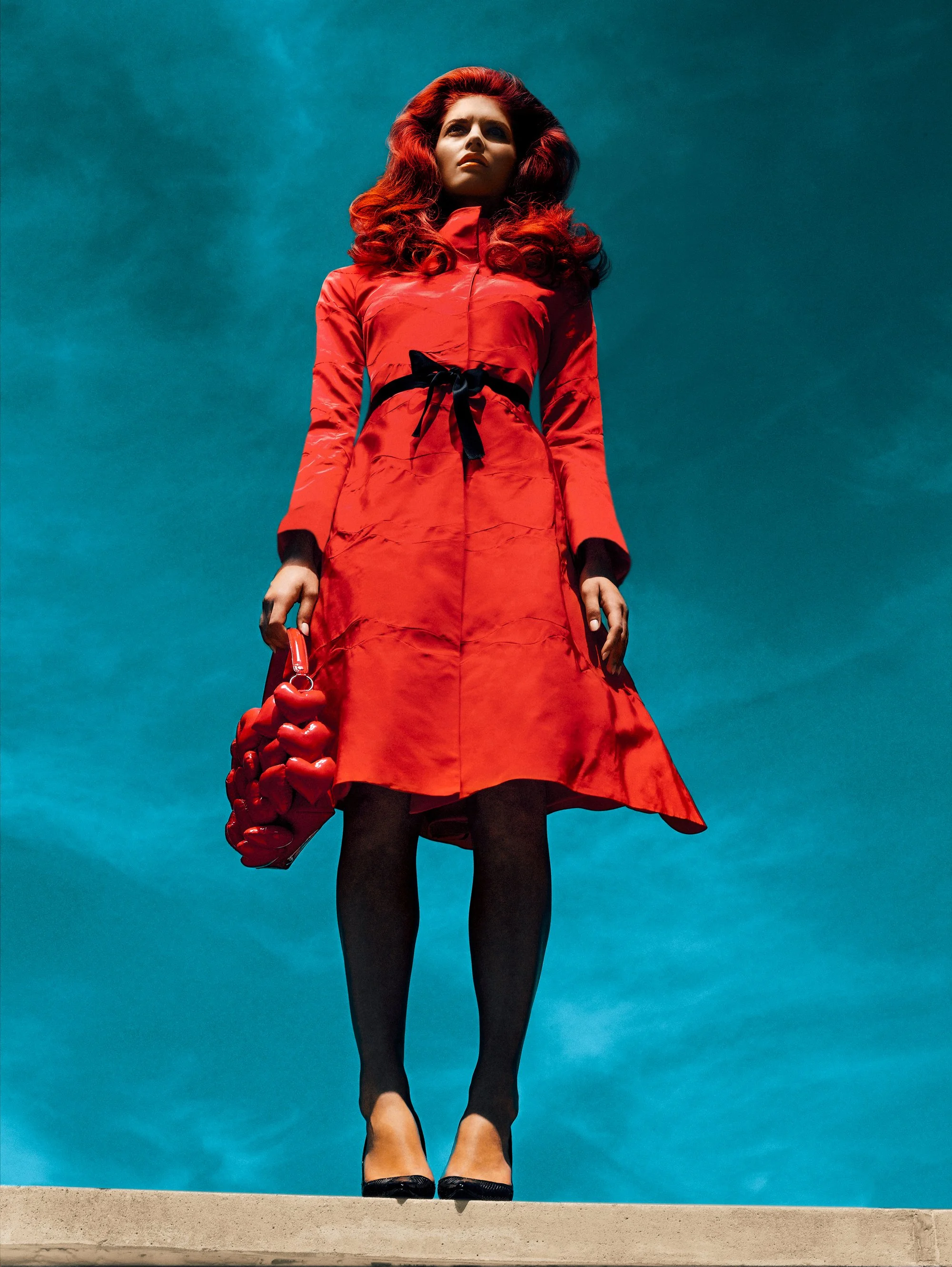 A woman with long red hair poses on a white chair wearing a sheer black top, patterned skirt, and black high-heeled boots.