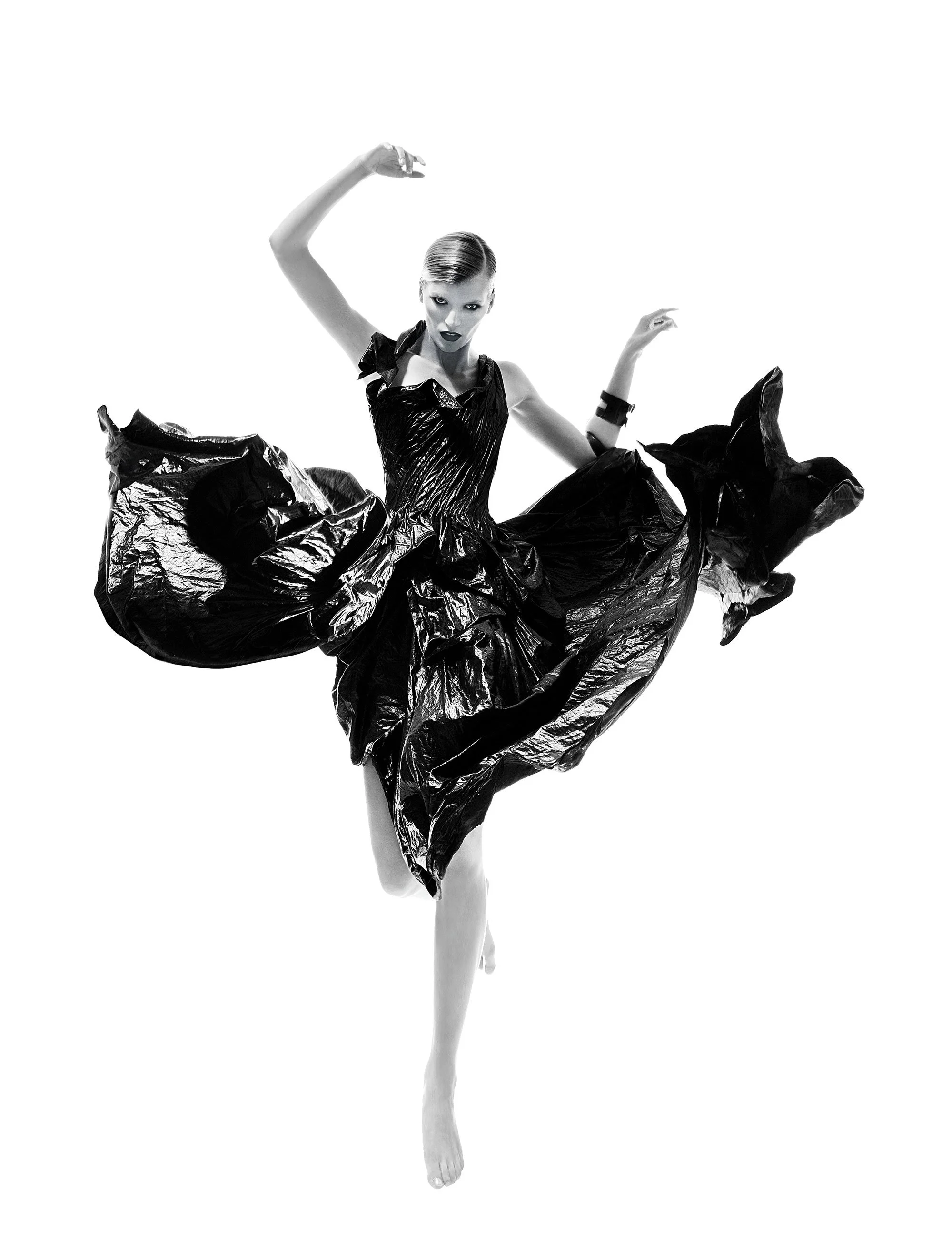 Black and white artistic photo of a woman in a black outfit with ruffled textures and abstract swirling lines in the background. View fullsize