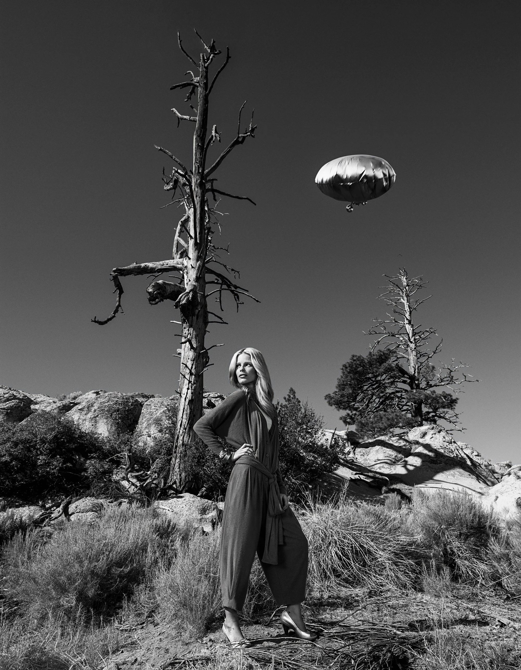A woman in a desert landscape with dry grass and rocks, standing with her hand on her hip. A parachute is descending in the sky, and there are two barren trees in the background.